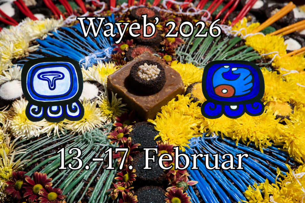 Diese Zeit des Wayeb’s ist eine Zeit des Gebets, der Konzentration und Transformation. Wir legen unsere alte Haut ab und reinigen uns von Altlasten, die uns im neuen Zyklus nicht mehr dienen. In Guatemaya wird in diesen 5 Tagen durgehend das Feuer gehalten. Es ist eine große Zeremonie, die das Licht für die ganze Welt, in dieser Zeit des Wandels, aufrechterhält.